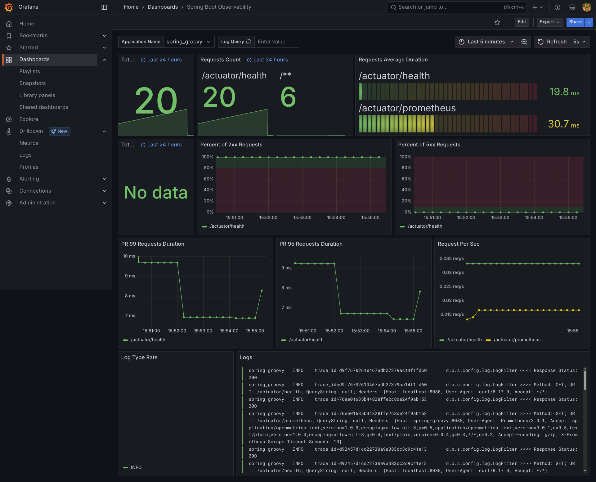 El patrón regex trace_id=\S+ span_id=\S+ trace_flags=\S+ (?P<type>\w+) \S+ --- extrae el nivel de log de tu formato de log de Spring Boot, habilitando el filtrado por tipo de log (INFO, ERROR, DEBUG, etc.) en Grafana.